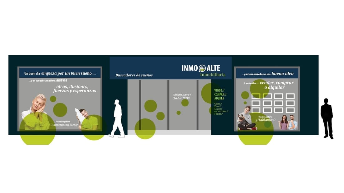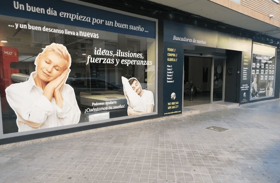El reto de este proyecto de esta fue integrarla fue con la rotulación integrar las dos partes, el primer escaparate era sobre colchones y la segunda para la inmobiliaria.